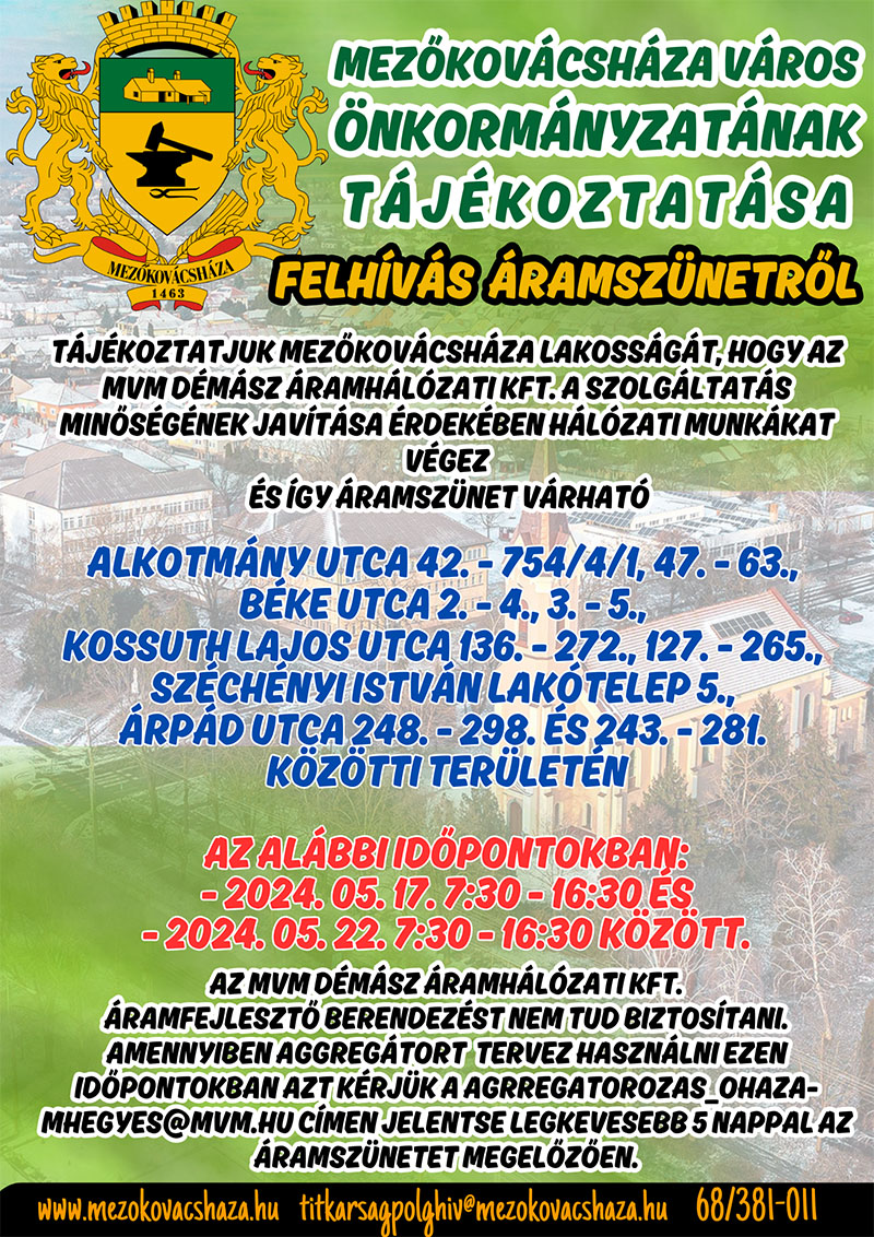 Mezőkovácsháza Város Önkormányzatának Képviselő-testülete 2024. március 27-én (szerdán) 13 órai kezdettel soros, nyílt ülést tart, melyre ezúton meghívom.