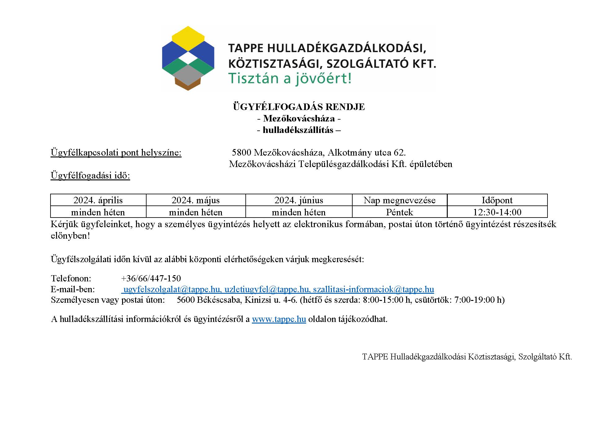 A TAPPE Hulladékgazdálkodási Köztisztasági, Szolgáltató Kft. értesíti a Lakosságot, hogy 2024. május 13-án (hétfőn) LOMTALANÍTÁSI NAPOT tart.