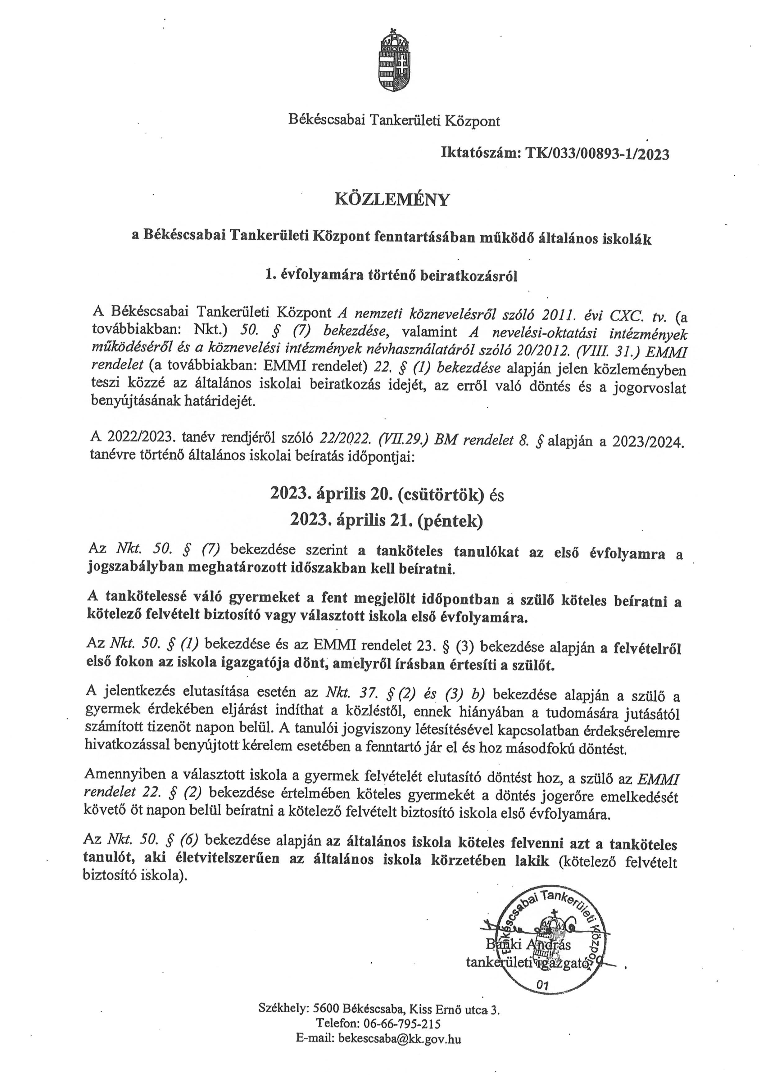 Közlemény a Békéscsabai Tankerületi Központ fenntartásában működő általános iskolák 1. évfolyamra történő beiratkozásáról