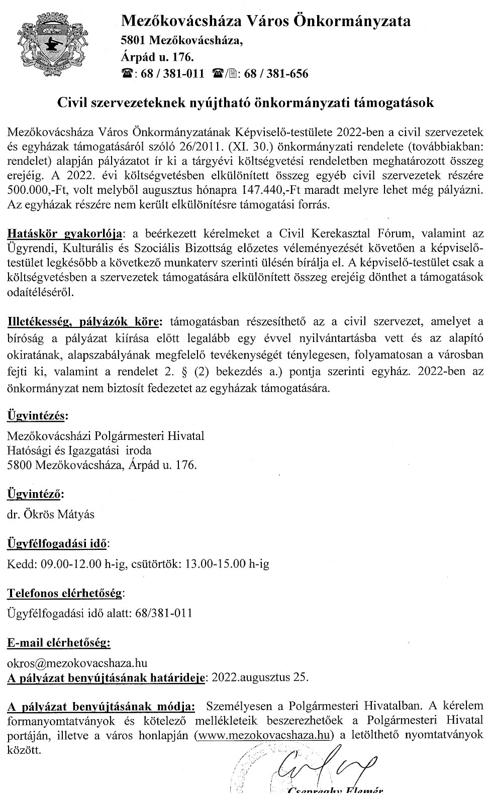 A Mezőkovácsházi Négy Évszak Óvoda és Bölcsőde új levelezési címe: 5800 Mezőkovácsháza, Árpád köz 6.